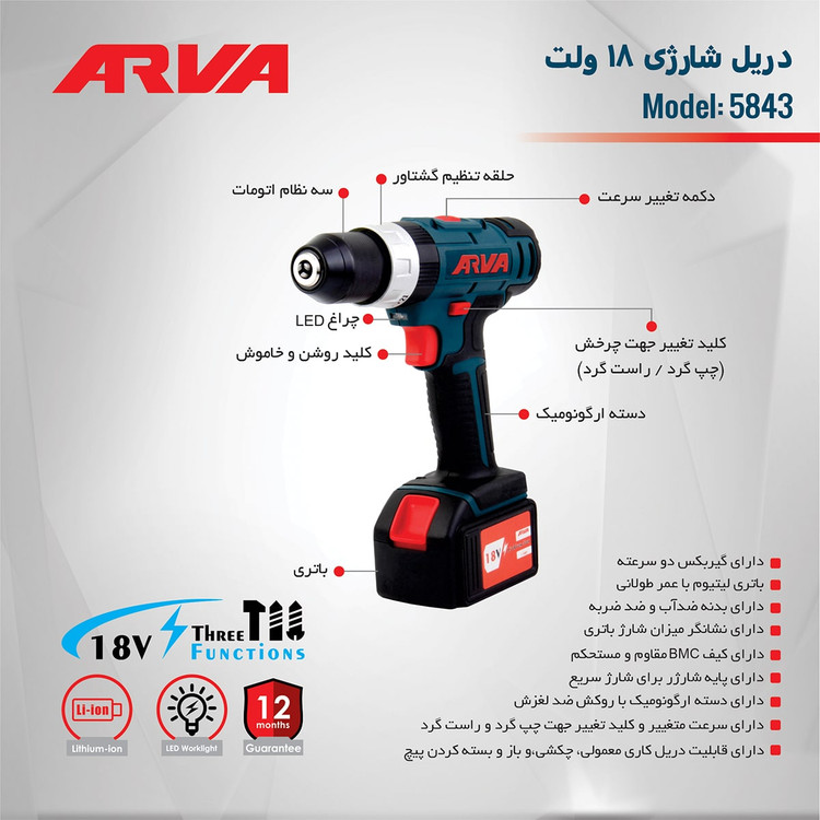 دریل پیچ گوشتی شارژی چکشی ۱۸ ولت مدل ۵۸۴۳ آروا