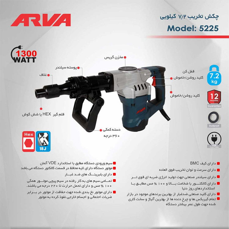 چکش تخریب ۷.۲ کیلویی ۱۳۰۰ وات مدل ۵۲۲۵ آروا