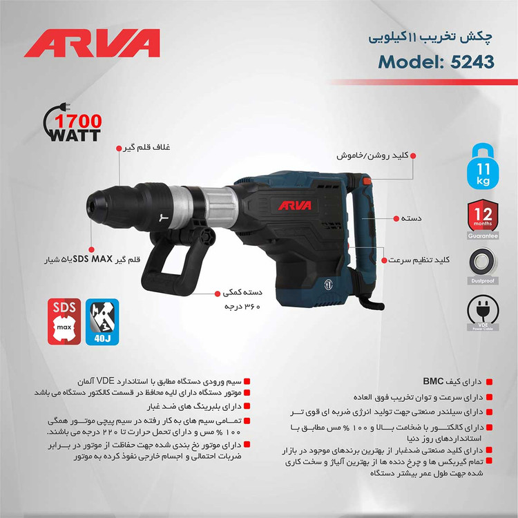 چکش تخریب مدل ۵۲۴۳ آروا دارای توان و قدرت ۱۷۰۰ وات است. این چکش تخریب دارای سرعت ضربه ۲۱۰۰ ضربه بر دقیقه بوده و قدرت هر ضربه آن ۴۰ ژول است. این ویژگی ها باعث می شود تا این ابزار قدرت بالایی داشته باشد. سیستم قلم گیر چکش تخریب ۱۱ کیلویی ۵۲۴۳ پنج شیار است. از دیگر اقلام همراه این ابزار می توان به دسته کمکی، قلم و مته و دفترچه راهنما اشاره کرد. مهمترین مزیت دستگاه مانند دیگر محصولات آروا، ۱۲ ماه گارانتی آن است.