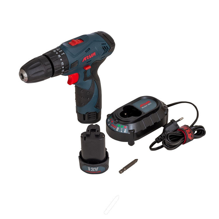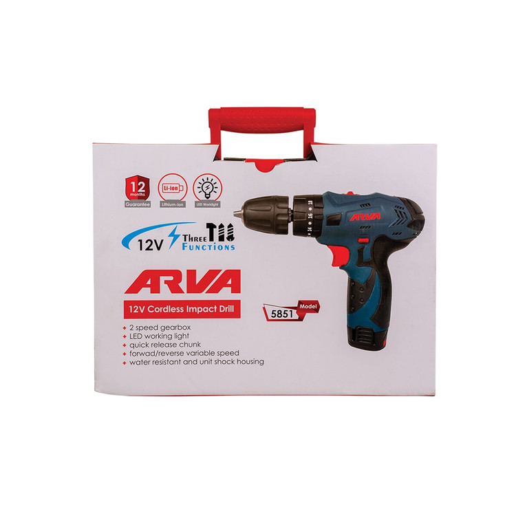 دریل پیچ گوشتی شارژی چکشی آروا مدل ۵۸۵۱ مجهز به سه نظام اتومات و ده میلی متری است و ولتاژ آن ۱۲ ولت است. دریل پیچ گوشتی شارژی آروا چند حالته است که هم می توانید برای سوراخکاری و هم برای پیچ بستن از آن استفاده کنید. داخل جعبه این مدل دریل شارژی علاوه بر شارژر یک عدد باتری اضافه نیز موجود است.